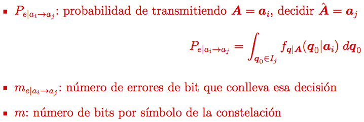 En la mayor parte de los sistemas de comunicaciones los símbolos se transmiten todos con la misma probabilidad. Para las siguientes cuestiones se asume que todos los símbolos se transmiten con la misma probabilidad. También se va a asumir que la transmisión se ha realizado sobre un canal gausiano (la única distorsión sobre la señal transmitida ha sido la suma de ruido térmico, blanco, gausiano, con densidad espectral de potencia N0/2).