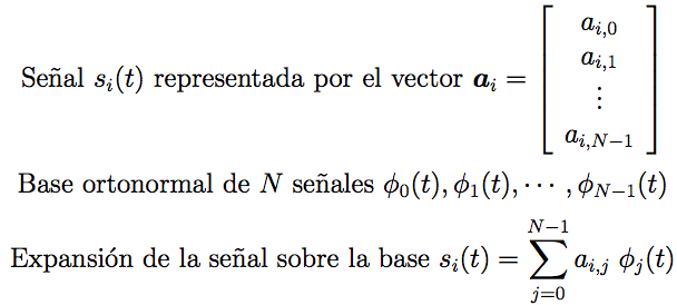 La representación vectorial de las señales facilita la tarea del diseño y análisis de un sistema digital de comunicaciones. Esta representación permite que una señal esté representada por un vector N-dimensional relacionado con una base ortonormal de N señales, tal y como se muestra a continuación