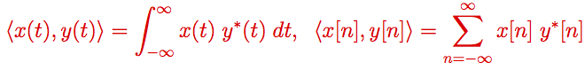El producto escalar definido en un espacio de Hilbert juega un papel determinante en la representación vectorial de las señales, ya que la elección del mismo determina entre otras cosas la relación de la representación vectorial con la energía de las señales. ¿Cuál es la definición de producto escalar más apropiada para la representación de señales de energía en tiempo continuo y en tiempo discreto?