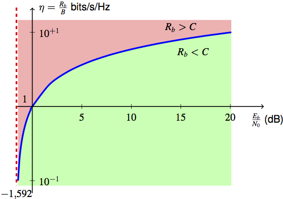 En canales gausianos, la capacidad del canal supone en la práctica una limitación sobre la tasa binaria espectral (cociente entre tasa de bit y ancho de banda disponible, en bits/s/Hz) en función de la relación señal a ruido de trabajo, que en muchos casos se parametriza a través de la relación entre la energía media por bit, Eb, y N0. Esta limitación se suele representar como una curva en el plano eficiencia vs relación Eb/N0. Explique qué representa en realidad dicha curva, y cómo se interpretan las diferentes regiones que aparecen en el espacio a partir de la misma.